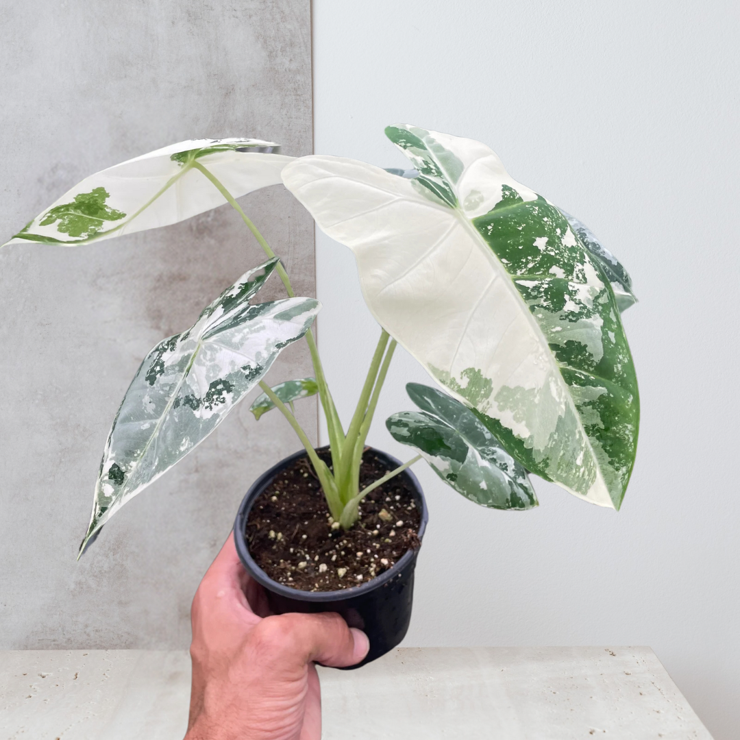 • Description: The Alocasia Micholitziana 'Frydek' Variegated has narrow, arrowhead-shaped, green leaves with pronounced white veins. The backsides of the leaves are burgundy.. The Alocasia Micholitziana 'Frydek' Variegated is a unique houseplant but beware that it is on the harder side to care for. It requires bright, indirect sunlight as well as soil that is constantly moist from watering. Toxic to pets.