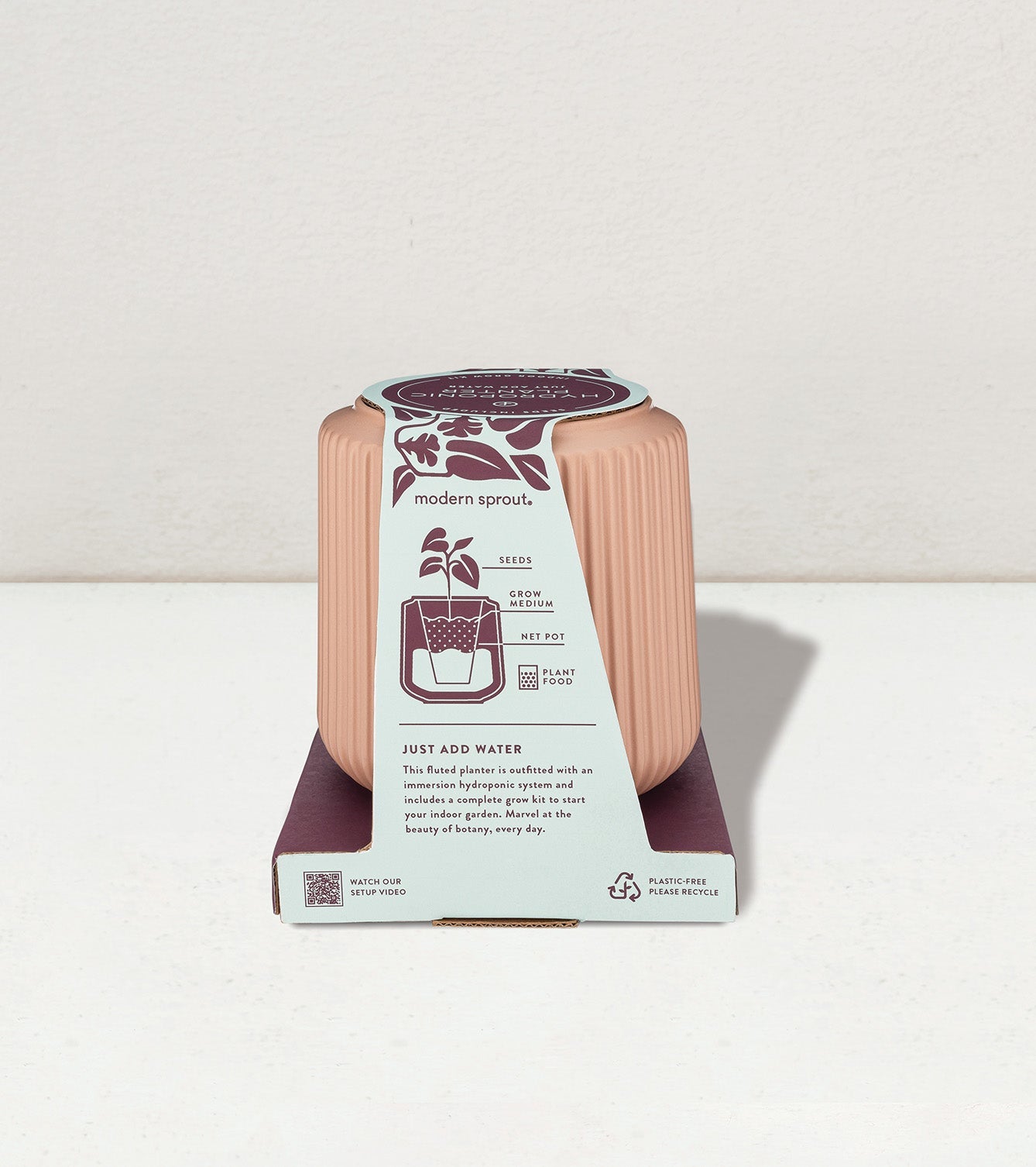 This fluted ceramic planter includes a complete grow kit with an immersion hydroponic setup that wicks water to flowers as needed. Just add water!