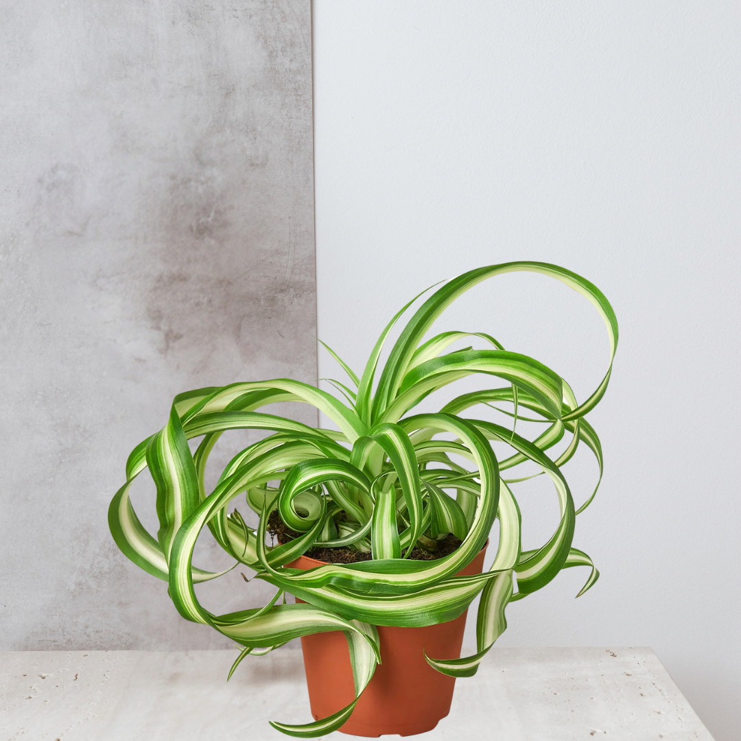 Description: Chlorophytum comosum 'Bonnie', commonly known as the Spider Plant 'Bonnie' or Curly Spider Plant, is a vibrant and eye-catching houseplant known for its curly, arching leaves that are green with white stripes. The leaves twist and turn, creating a dynamic and playful appearance that adds a touch of whimsy to any indoor space. This compact and hardy plant is a variation of the traditional spider plant and is native to South Africa. The Spider Plant 'Bonnie' is well-loved for its air-purifying qualities and ease of care, making it an excellent choice for both beginners and experienced plant enthusiasts. It typically grows up to 8-12 inches tall and wide, making it ideal for small spaces and containers.
