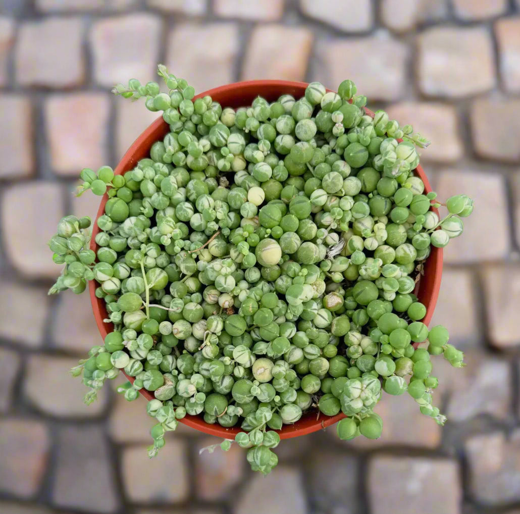 • Description: You will love this remarkable succulent for its easy-going nature and usual pearl-like foliage. If you think all green leaves are stereotyped, this String of Pearls has unusual spherical leaves with green and cream variegation. As they grow, the stems form a delicate cascade, which has a restful effect on the mind, much like trickling water.