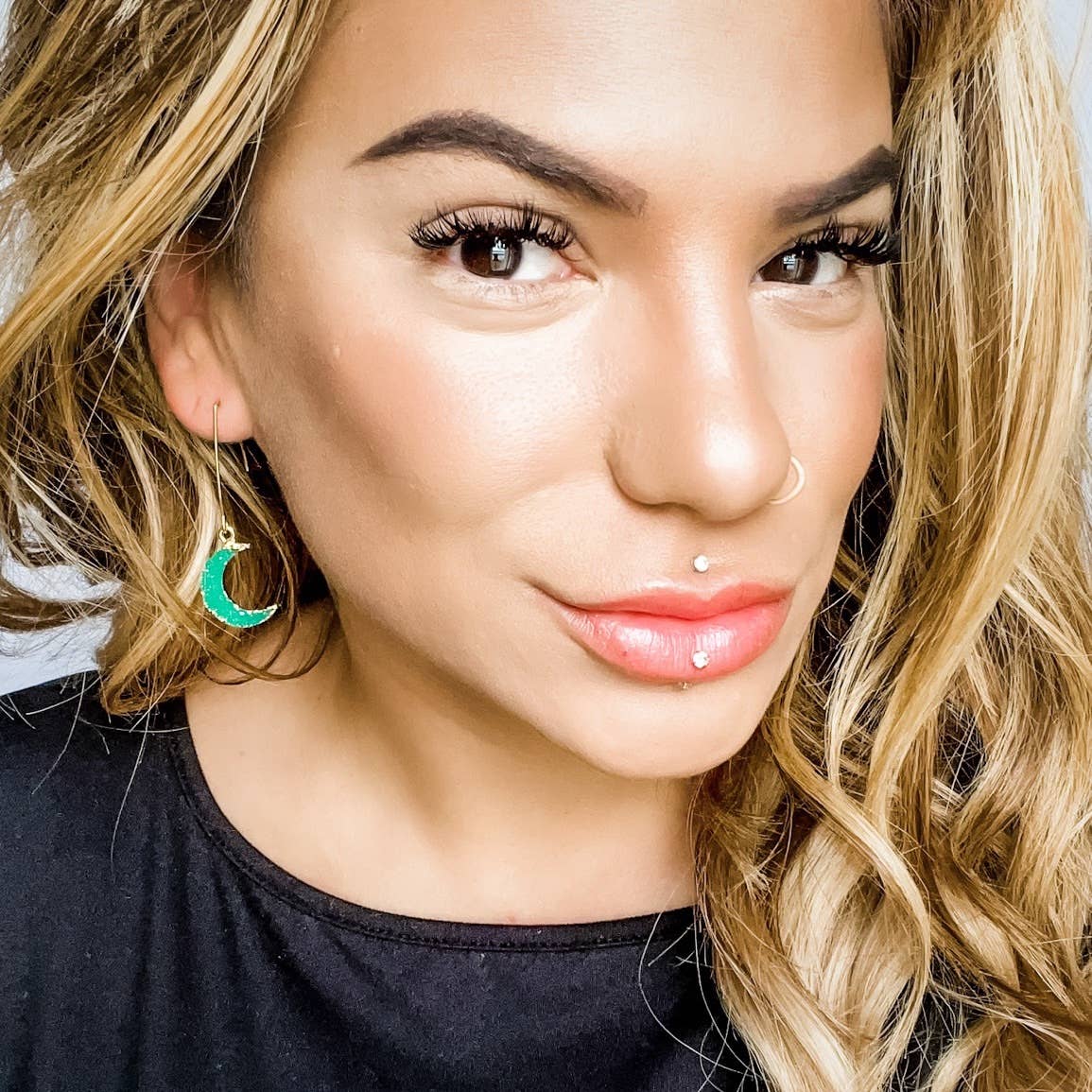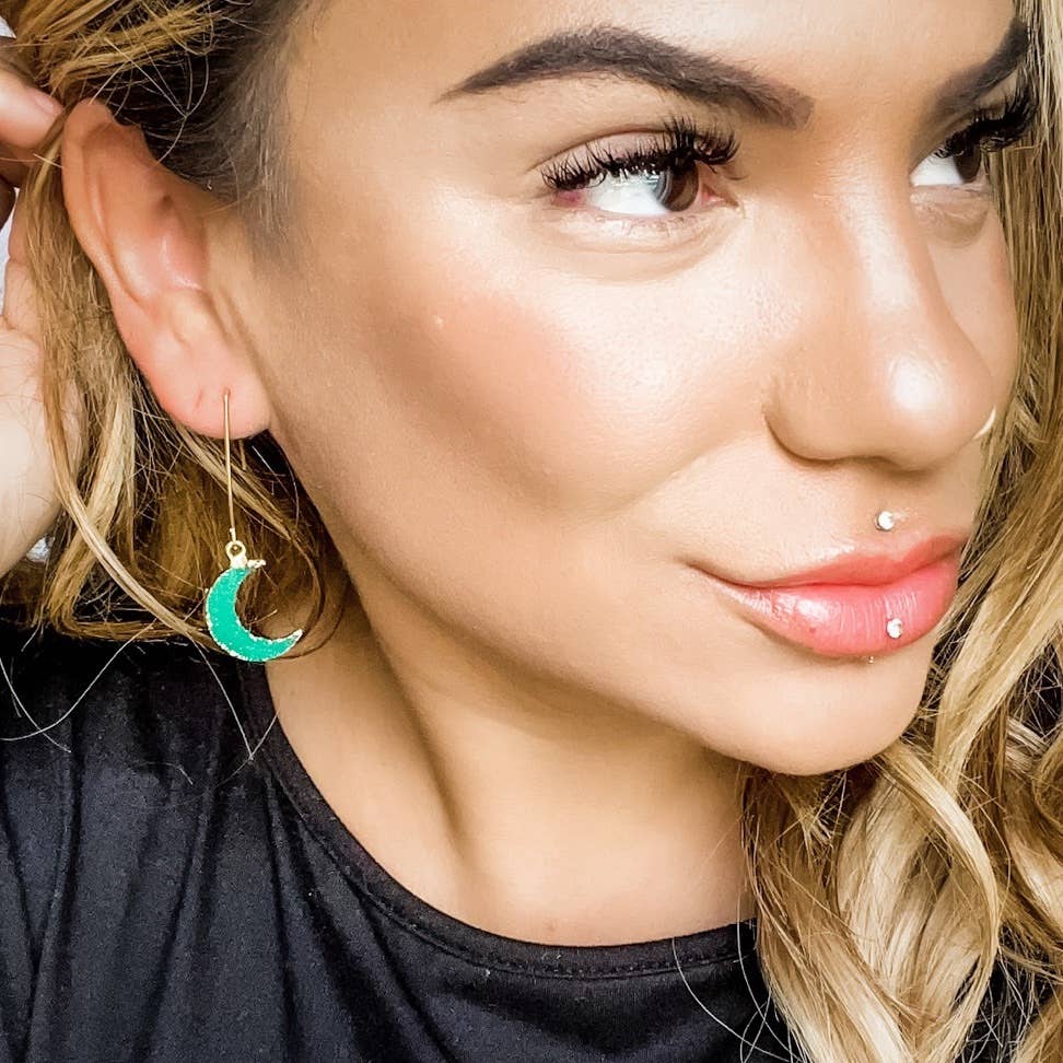Waxing and Waning Moon is classic and features: *Gold-toned V-hook *Gold-edged Green Crescent Moon Faux Druzy Charms *Each moon is unique- size and color will vary slightly *Measures 2" from the top *Hooks are Gold-toned Stainless Steel *Great for sensitive ears *Made in the USA Always wear rubber backs with dangle style earrings